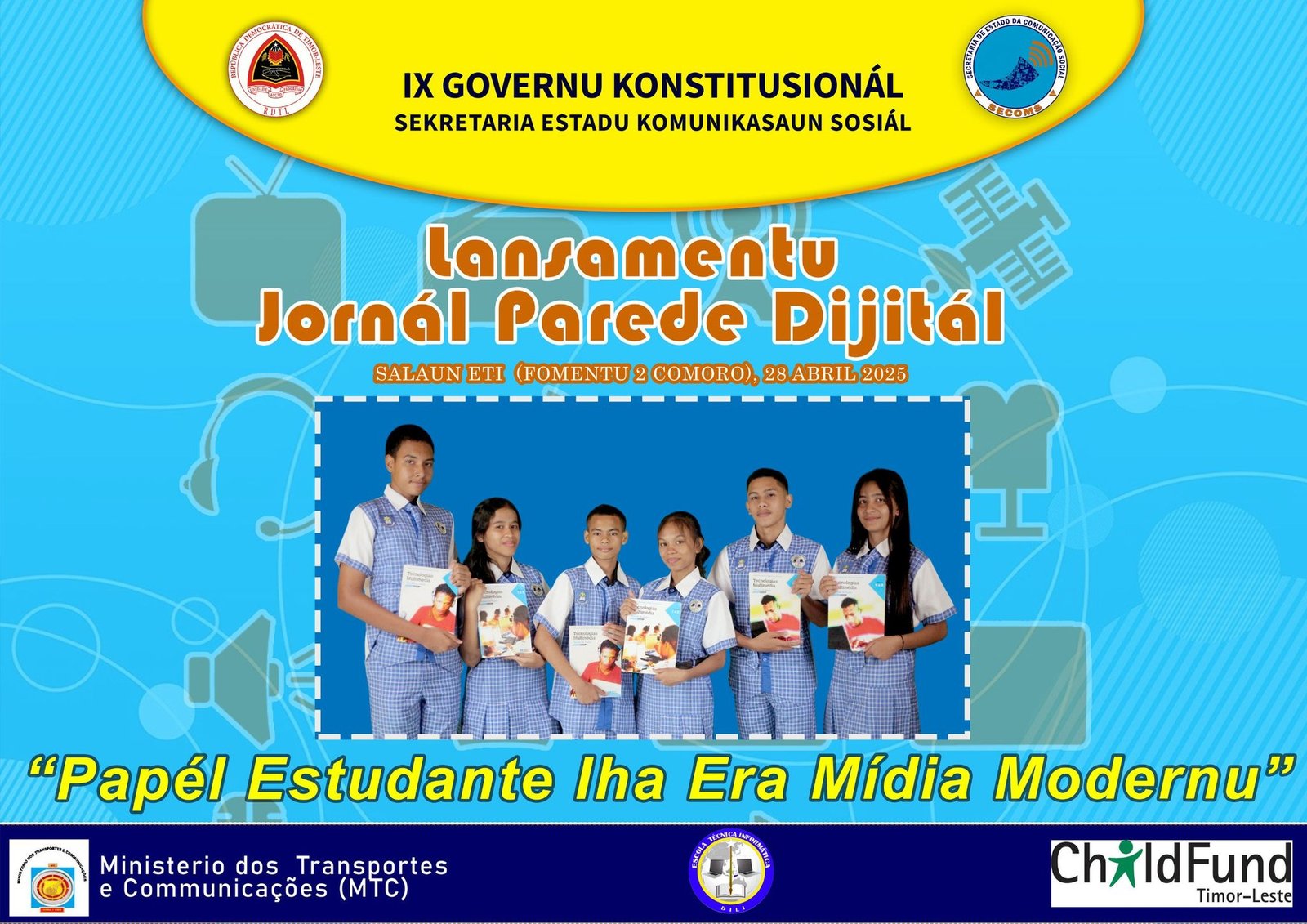 𝐃𝐢𝐥𝐢, 𝟐𝟖 𝐀𝐛𝐫𝐢𝐥 𝟐𝟎𝟐𝟓, IX Governu Konstituisionál liuhosi Sekretaria Estadu komunikasaun Sosiál (SEKOMS) servisu hamutuk ho Ajénsia Internasionál Chilfund Timor-Leste (CFTL) segunda-feira ne’e lansa dahuluk Jornál Parede dijitál ne’ebe hahu ona hosi Escola Tecnica Informatica-Dili (ETI-DILI) , lansamentu ne’e realija iha salaun ETI Fomentu 2 Dili.
